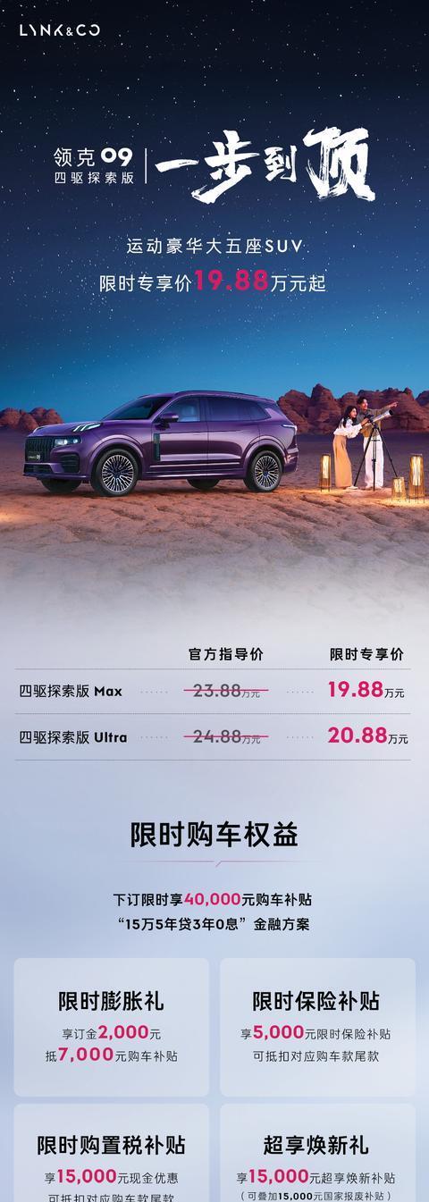 在新能源SUV热潮汹涌的当下,2026款领克09四驱探索版以燃油车的身份交出了一份令人惊喜的答卷。四驱探索版Max限时19.88万元、Ultra版限时20.88万元的价格,凭借其硬核的机械素质和奢享的配置,成为了30万元以内中大型SUV中的全能之选,为消费者在燃油车领域开辟了一片新的天地。