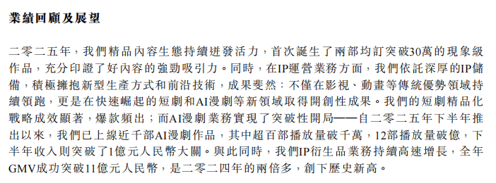 早在去年年中发布财报的时候,阅文就揭晓了半年度的IP衍生品业务营收接近2024年全年的成果,所以全年GMV翻倍并不意外,真正值得期待的,是随着AI的发展,还有多少商业化的潜能将会脱缰而出。
